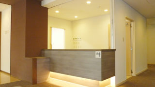 山形県米沢市にある「病院」の木製建具を製作いたしました。こちらは受付カウンターです。高級感と清潔感あるカラーになっています。足元に間接照明をつけたり、カバンを載せたり、手すりがわりに寄りかかったりできる台を柱とカウンターと完全に調和するデザインのでお作りしました。