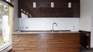 山形県にある「旅館」のオーダーメイド木製建具を製作いたしました。こちらはオリジナルのカウンターキッチンです。限られたスペースにスッキリと収まっていて、既製品にはない重厚感と高級感があります。旅館のダイニングですので、リゾート雰囲気を醸し出す組み木のデザインになっています。