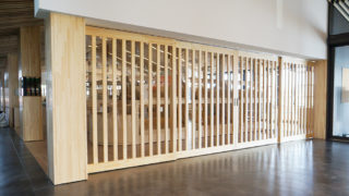 公共事業として山形県米沢市にある「道の駅米沢」の木製建具を製作いたしました。 こちらはテナントの扉とディスプレイの事例です。ご利用の際には、デザインや収まり感をぜひお確かめください。